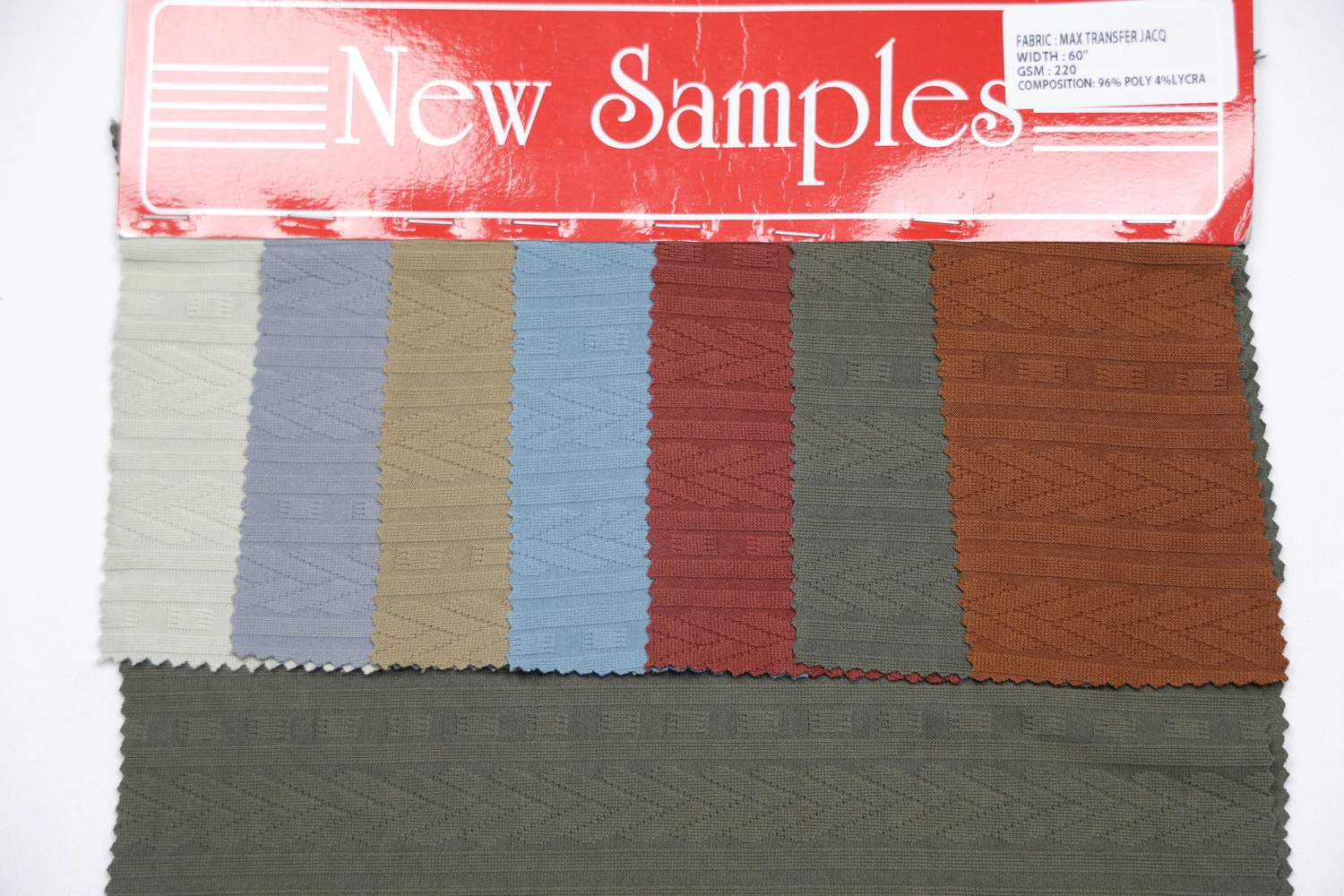 Max Transfer Jacq Poly Lycra is a premium jacquard knitted fabric made from a high-quality polyester and lycra blend. The fabric features an inbuilt jacquard texture that is woven into the structure, giving it a refined, modern look that does not fade or wear off over time. It offers excellent 4-way stretch with strong recovery, ensuring long-lasting shape retention even after repeated use.