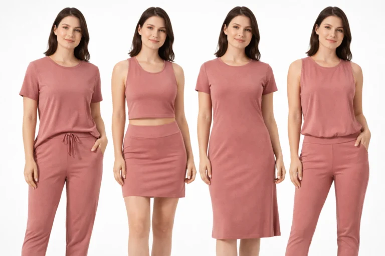 The fabric surface has a refined, uniform texture that looks premium on camera and in daily use, making it a dependable choice for both fashion basics and athleisure/performance collections.